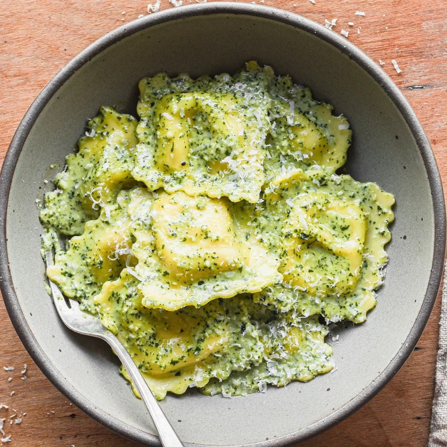 Cheese ravioli made with pesto sauce.