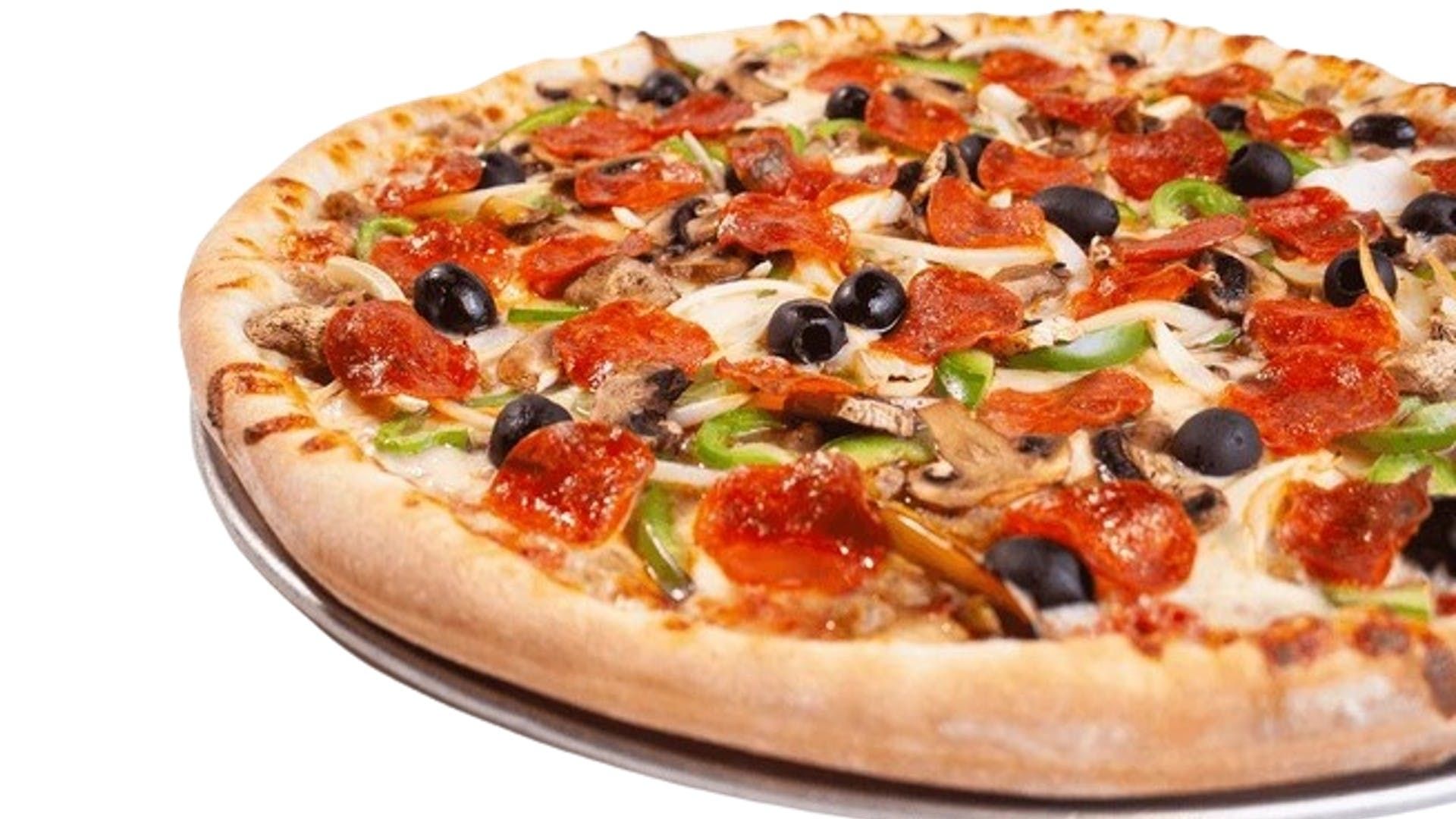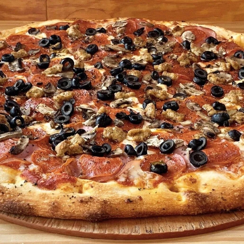 Onions, bell peppers, mushrooms, black olives, pepperoni, and sausage.