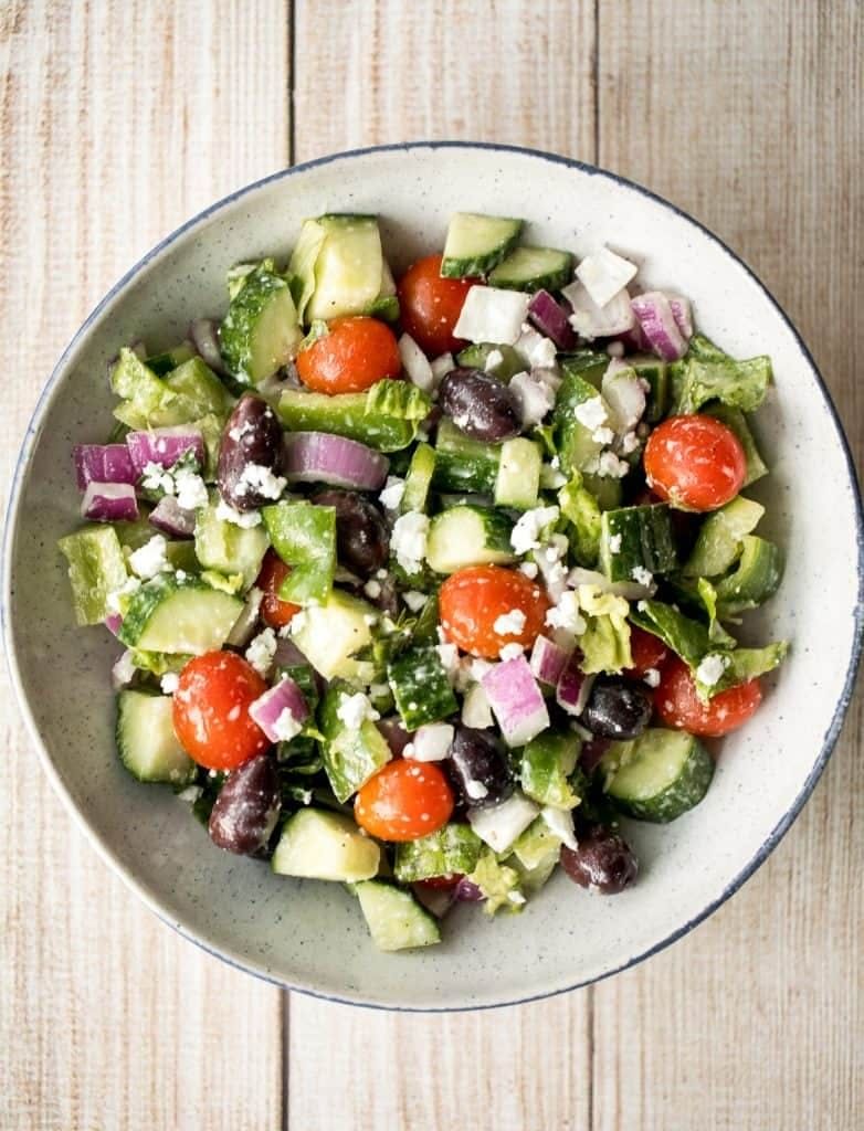 Romaine lettuce, carrot, red cabbage, cucumber, grape tomatoes, red onions, pepperoncini, artichoke hearts, green olives, and feta cheese.