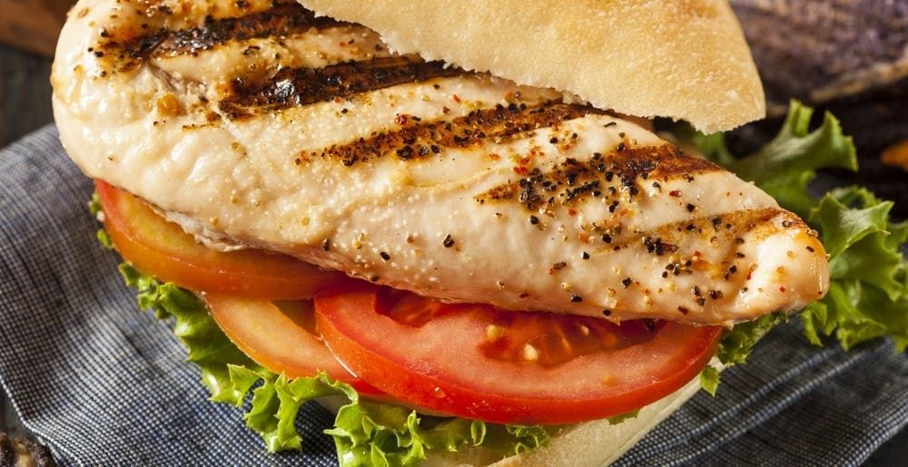 Grilled chicken, romaine lettuce, parmesan cheese, feta cheese, grape tomatoes, and croutons.