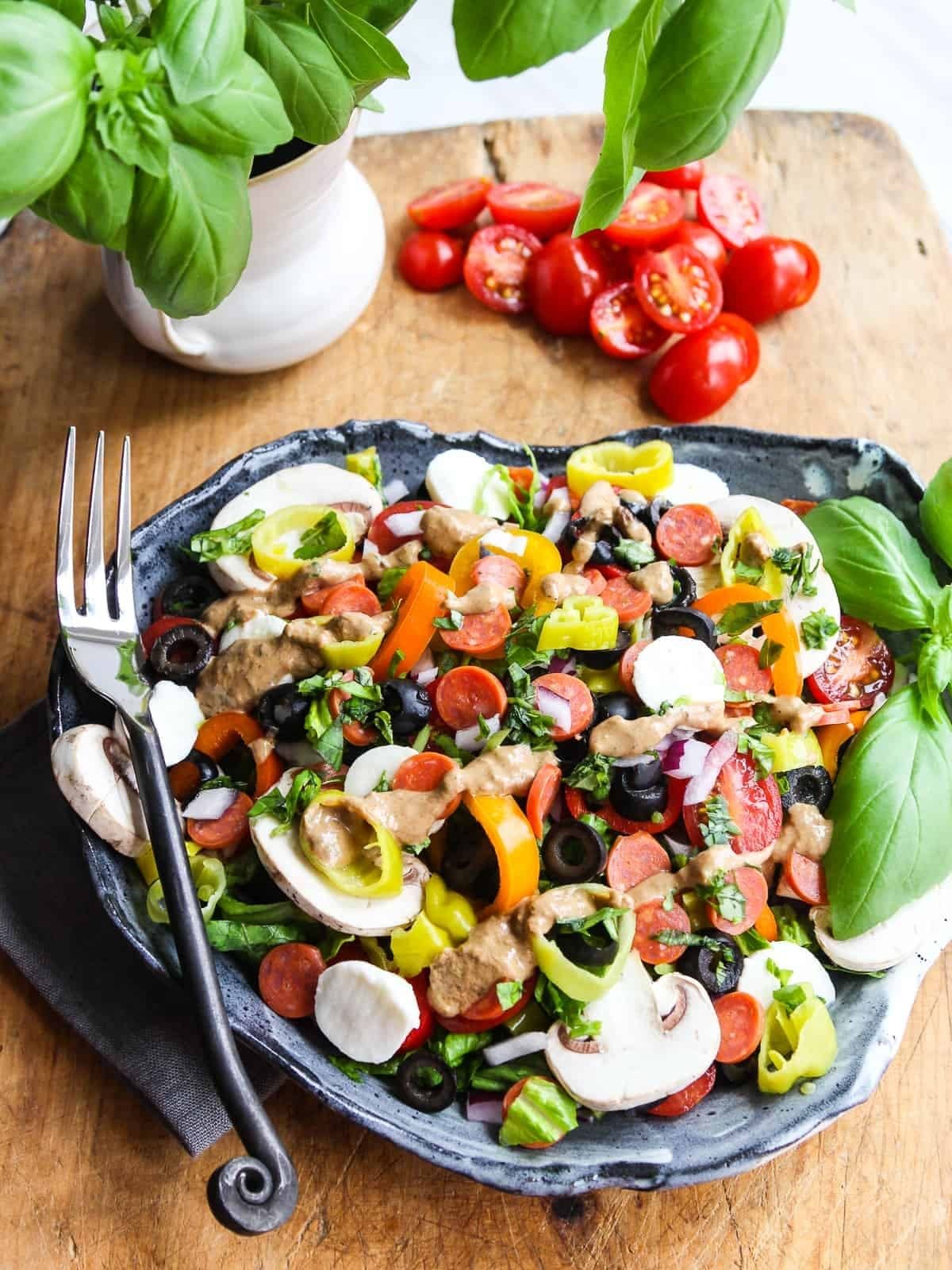 Romaine lettuce, carrot, red cabbage, cucumber, grape tomatoes, salami, and fresh mushrooms with mozzarella cheese.