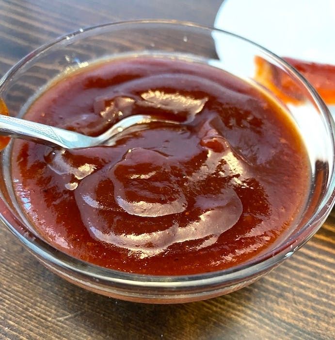 BBQ sauce, chicken, red and green onions.