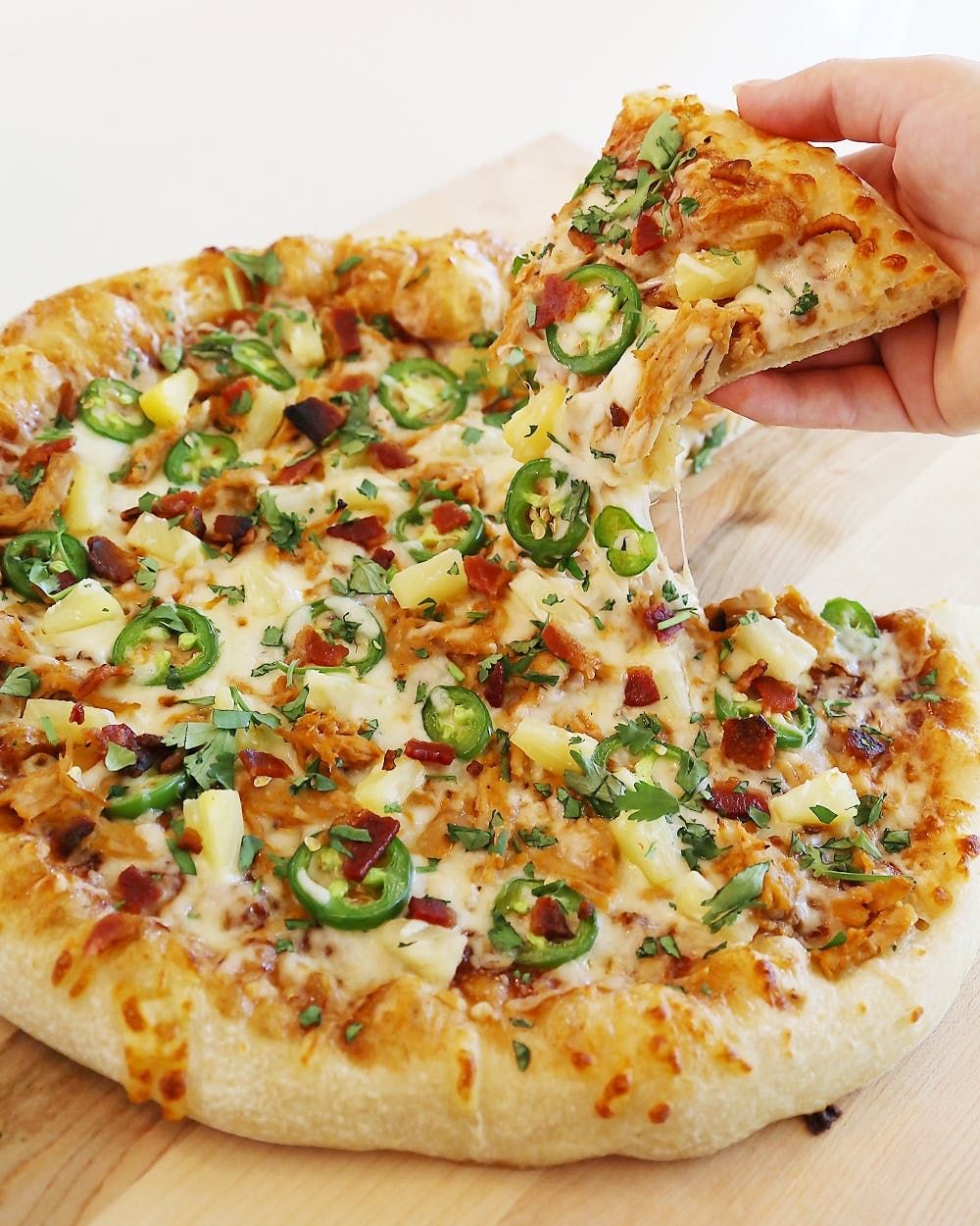 Ham, pineapple, bacon pieces, jalapenos, and parmesan cheese.