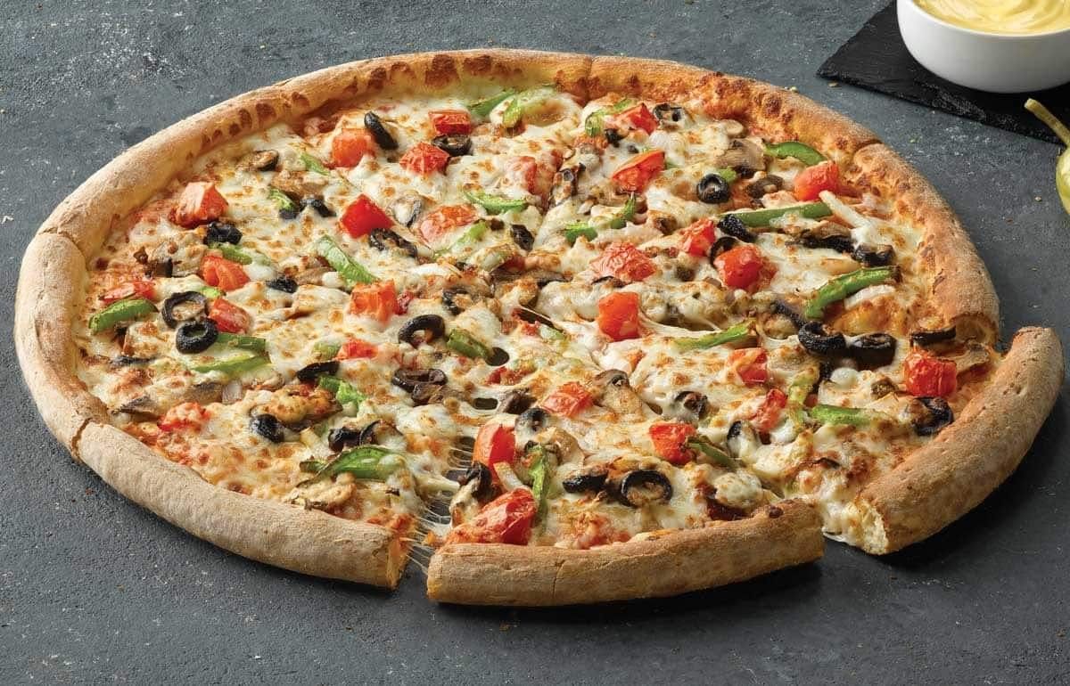 Bell peppers, mushrooms, spinach, tomatoes, zucchini, black olives, and artichoke hearts.